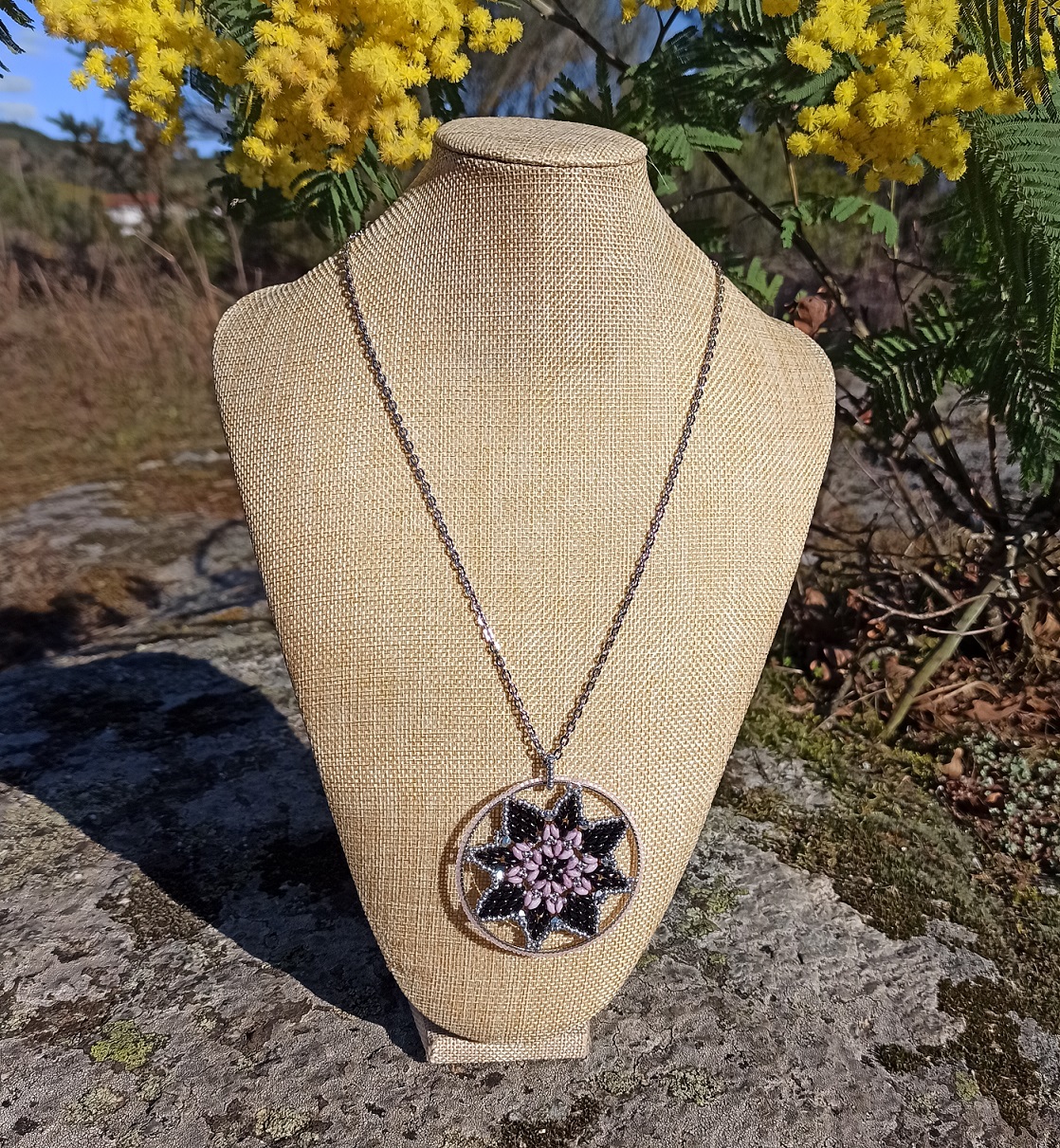 Colgante mándala negro y rosa de cristal checo de alta calidad en sus piezas, son de tal precisión que encajan a la perfección en esta forma circular, con colores jugosos y amplia variedad de opciones a la hora de engarzarlas a mano. cadena y cierre de acero.