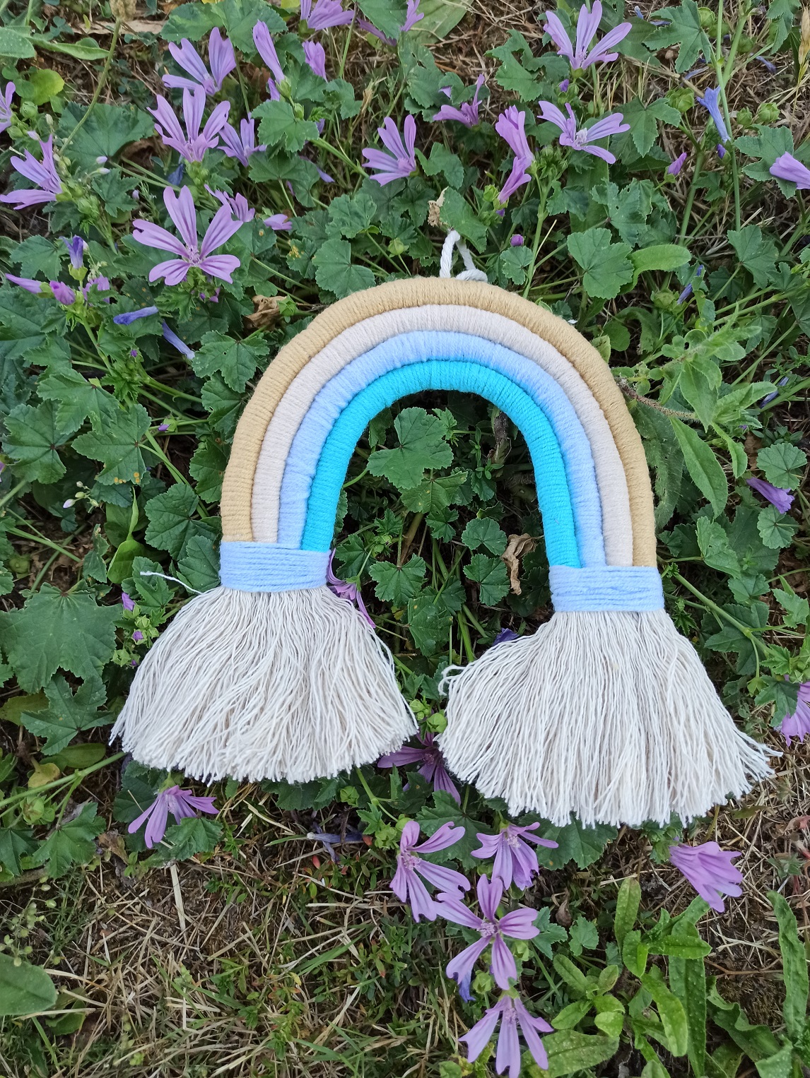 Arco iris es un símbolo de transformaciones y cambios en la vida está realizado con cordón de macramé y lana de colores. medidas largo 17cm y ancho14cm aproximadamente, como es puramente artesanal puede haber pequeñas variaciones en el producto.