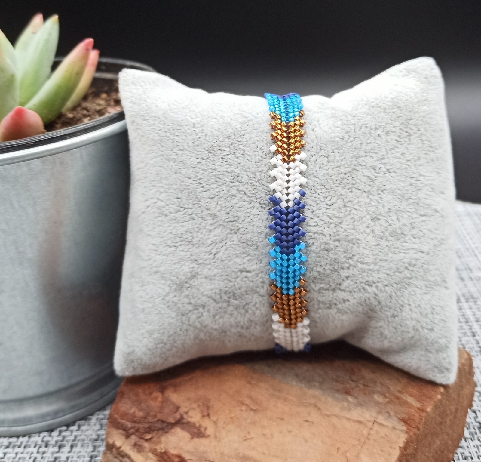 Pulsera ligera, versátil, realizada artesanalmente con cuentas Miyuki originarias de Japón reconocidas por su alta calidad, precisión y uniformidad en tamaño y forma. estas cuentas destacan por su estructura regular y de bordes lisos lo que las hace ideales para la técnica de tejido peyote, encajando perfectamente entre si logrando patrones y diseños detallados como el de esta pulsera